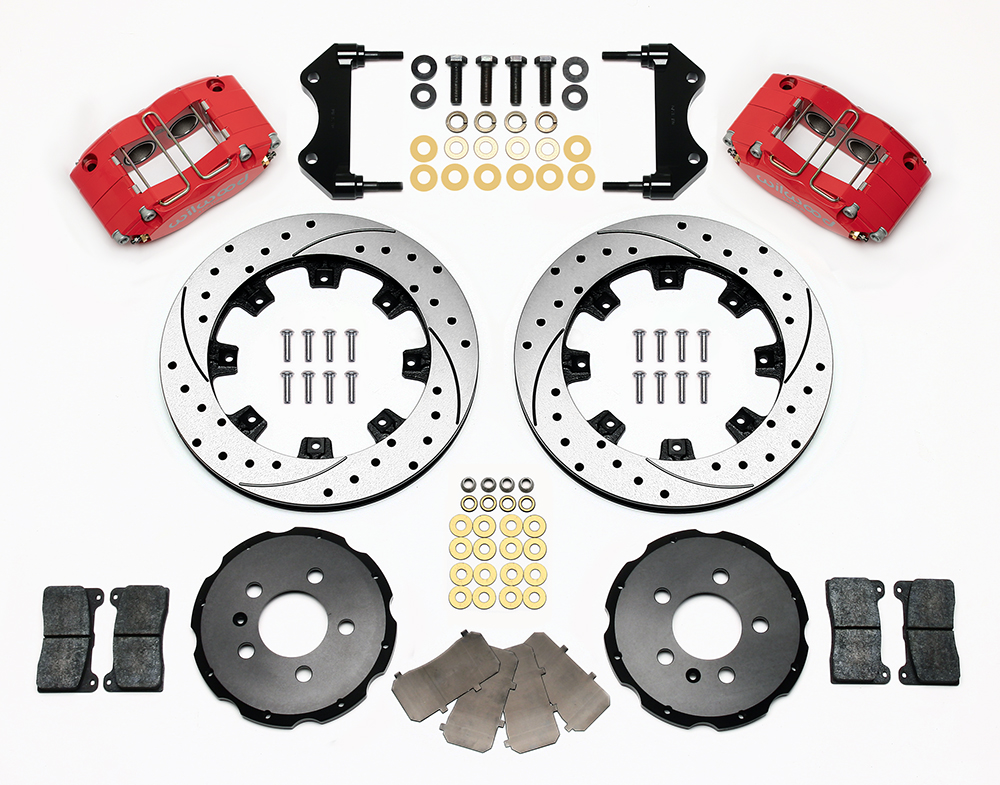 Wilwood Dynapro Radial Big Brake Front Brake Kit (Hat) Parts Laid Out - Red Powder Coat Caliper - SRP Drilled & Slotted Rotor Wilwood Dynapro Radial Big Brake Front Brake Kit (Hat) Parts Laid Out - Red Powder Coat Caliper - SRP Drilled & Slotted Rotor Zoom Image