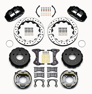 Wilwood Forged Narrow Superlite 4R Big Brake Rear Parking Brake Kit Parts Laid Out - Black Powder Coat Caliper - SRP Drilled & Slotted Rotor Wilwood Forged Narrow Superlite 4R Big Brake Rear Parking Brake Kit Parts Laid Out - Black Powder Coat Caliper - SRP Drilled & Slotted Rotor Zoom Image