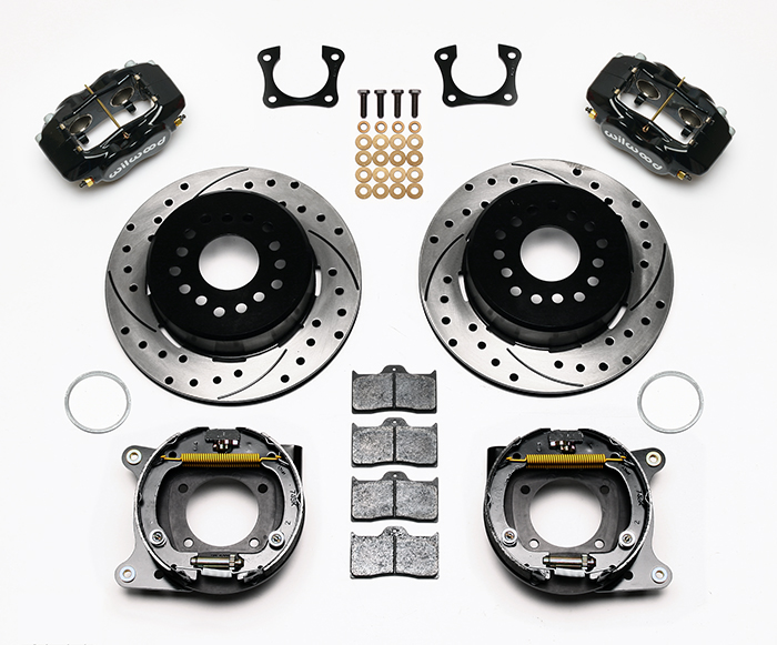 This group of FDL Pro-Series rear disc kits provides a complete solution for popular muscle car rear axles that require a parking brake. Forged billet Dynalite four piston calipers, 12.19” one-piece drum/rotors, and high friction pads provide optimized and balanced braking for all types of custom performance street/strip and show machines. The neatly hidden internal shoe system provides a clean installation with superior static holding power for parking. Optional caliper finishes and rotor designs enable the builder to personalize the style and optimize brake performance for every individual application.