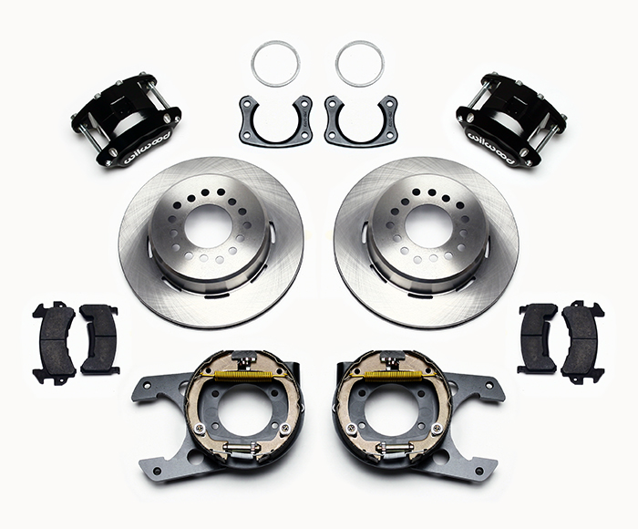 D154 Pro-Series rear disc kits provides a complete solution for popular muscle car rear axles that require a parking brake. Forged D154 dual piston calipers, 12.19” one-piece drum/rotors, and high friction pads provide optimized and balanced braking for all types of custom performance street/strip and show machines. The neatly hidden internal shoe system provides a clean installation with superior static holding power for parking. D154 rear caliper kits offer a complimentary match to vehicles using Wilwood D52 or D154 calipers on OE spindles. Optional caliper finishes and rotor designs enable the builder to personalize the style and optimize brake performance.