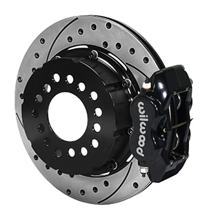 FDL Pro-Series rear disc brake kits provide a complete solution for popular muscle car rear axles on applications where individual wheel parking brake assemblies are not required. Forged billet Dynalite four piston calipers, two-piece hat and rotor assemblies, and high friction pads provide optimized and balanced braking for all types of off-road, competition, and other customized applications. FDL calipers can be optioned with a full range of finishes to reflect personalized style. Rotor choices provide options for high-tech show winning style, or heavy weight durability and cooling capacity for high heat competition.