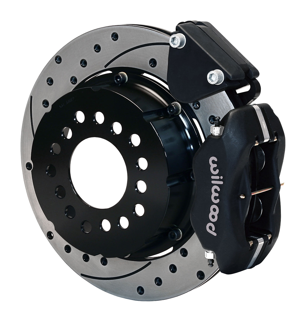 FDL Pro-Series rear disc brake kits with parking brake provide a complete solution for popular muscle car rear axles on applications where internal drum parking brake assemblies interfere with c-clip eliminator assemblies. Forged billet Dynalite four piston calipers, Mechanical Spot calipers, two-piece hat and rotor assemblies, and high friction pads provide optimized and balanced braking for all types of off-road, competition, and other customized applications. FDL calipers can be optioned with a full range of finishes to reflect personalized style. Rotor choices provide options for high-tech show winning style, or heavy weight durability and cooling capacity for high heat competition.